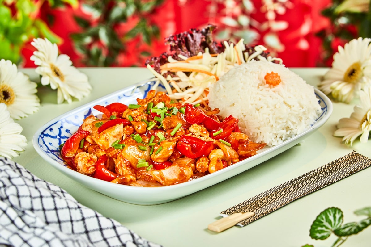 Vår mest populære wok med kylling, paprika, løk, vårløk, cashewnøtter, babymais, hvitløk og chili. Velg ønsket styrkenivå.