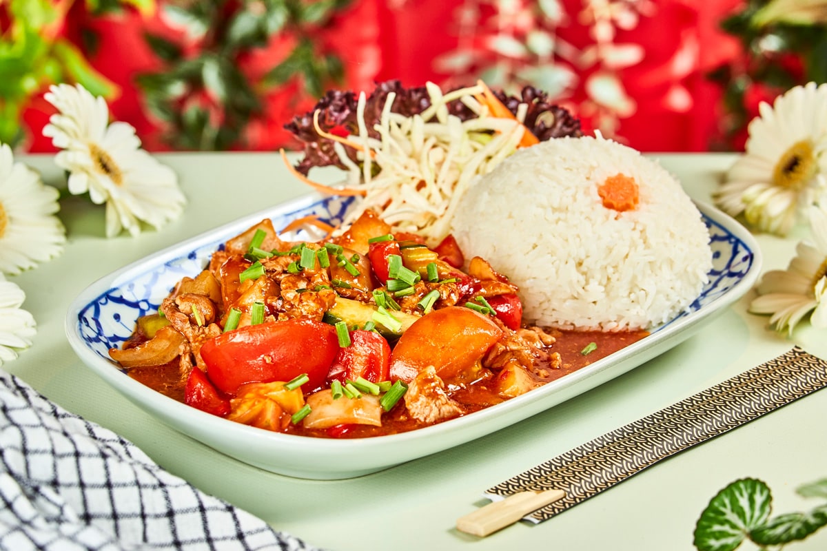 Klassisk wok med svinekjøtt, paprika, løk, hvitløk, vårløk, ananas, agurk og tomat. Velg ønsket styrkenivå.